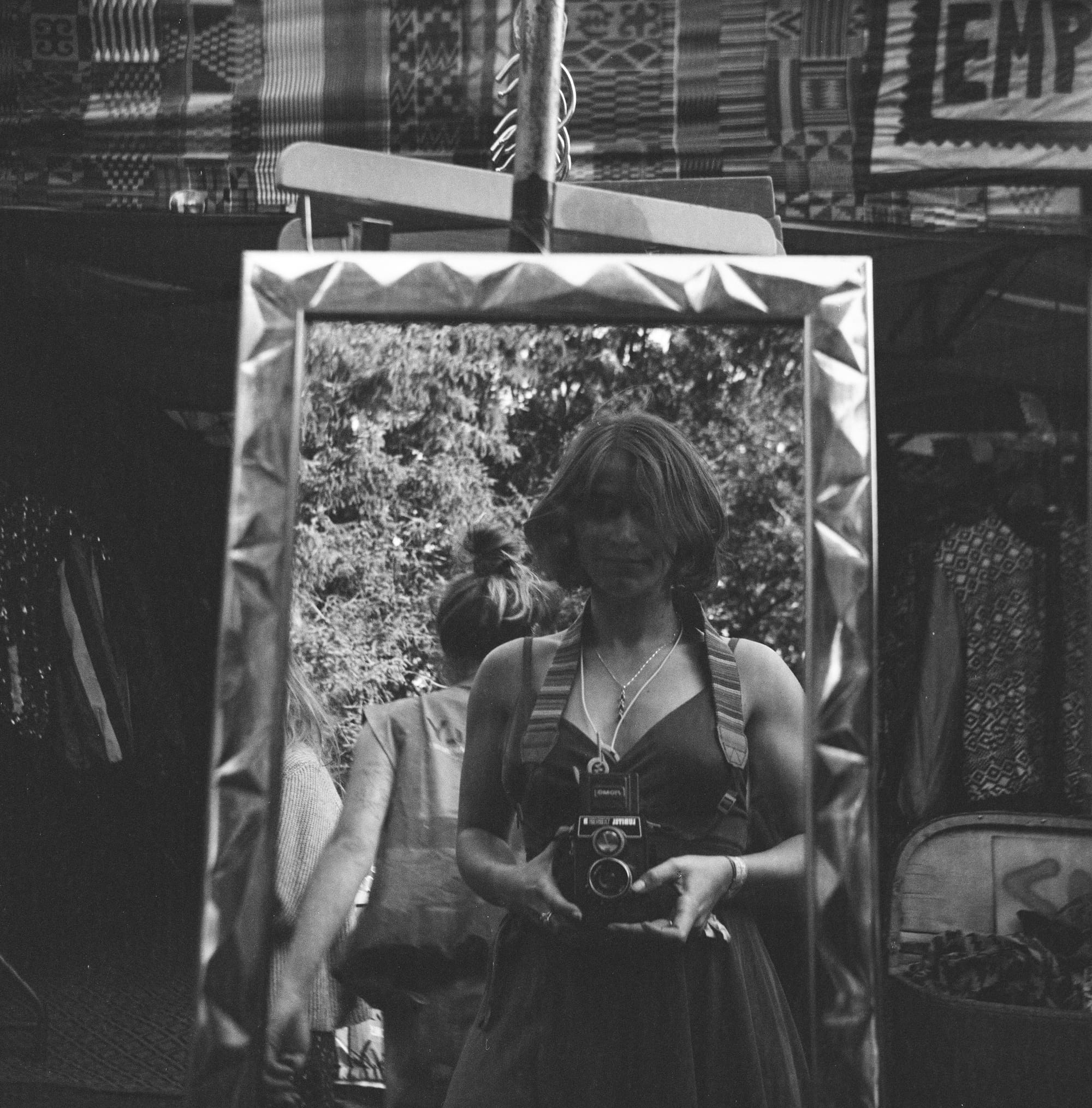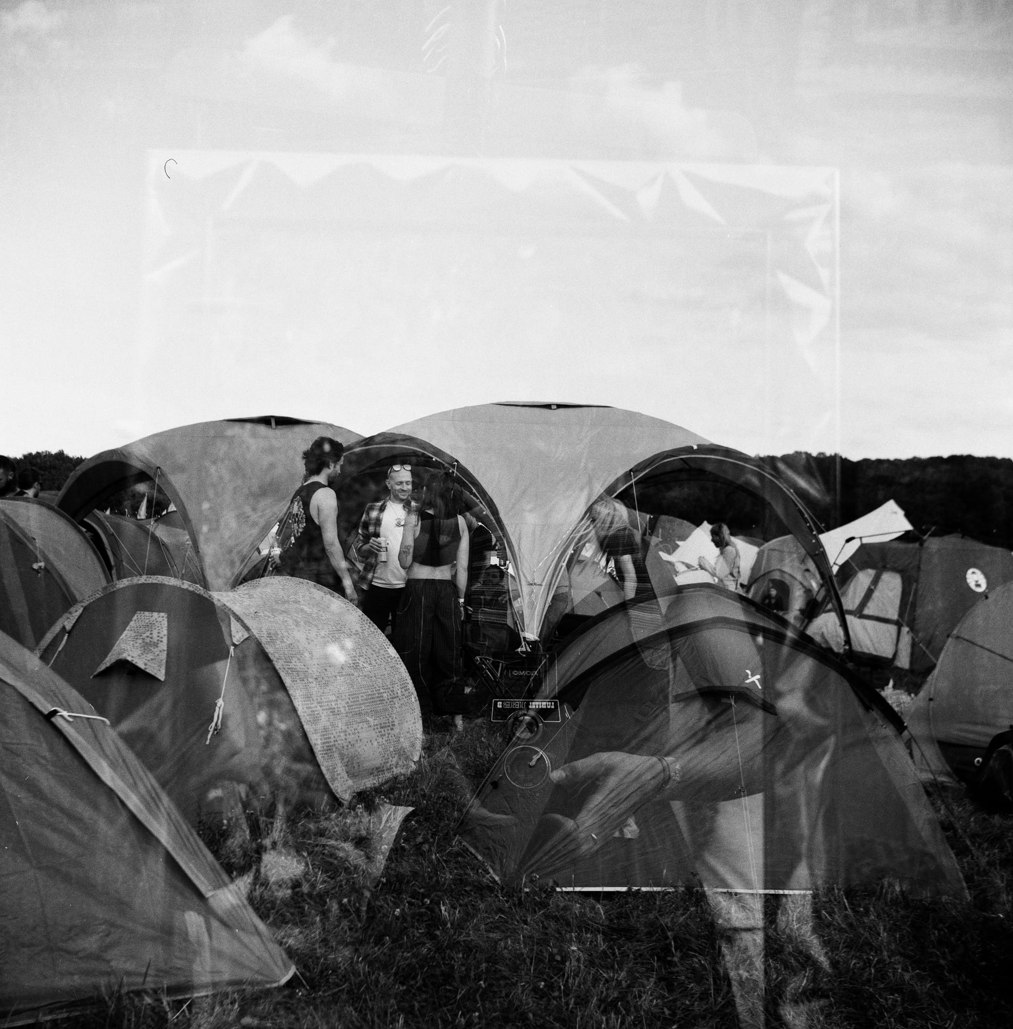 Whilst getting used to a new camera you will always make mistakes, but just because they weren’t intended doesn’t mean they won’t be happy accidents. There were numerous accounts when I had forgotten to roll onto my next shot before taking another photograph, this meant I had exposed the same square of film twice, resulting in a double exposure. Below is one of my favourite accidents. Every year I meet up with the same group of friends that I met the first time I went to this festival and every year since this wonderful group of kind-hearted and hilarious people have expanded in quantity. This year the growth of our Noisily family was most evident as we had expanded our HQ from one gazebo to two, this was a big deal! As I tiptoed around guide ropes towards our camping base I saw the ever so familiar scene of friends chatting and catching up on a year’s worth of stories. I stopped and quickly snapped a shot unnoticed, hoping to immortalise the memory. Little did I know, that I had forgotten to roll onto a new shot and I had taken a photo over a self-portrait I had taken in a mirror by the clothing stalls moments before. Resulting in a beautiful photographic paradox, both the subject and the photographer captured in the same frame. I love this shot so much, my friends framed within the photo by the frame of the mirror I had taken my own picture in. The silver details of the camera cutting through that second exposure to reveal the source of the photograph. A photo of the photographer, photographing her friends. It’s soft, warm and slightly confusing which perfectly encapsulates the Noisily experience.
